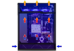 LA EVOLUCIÓN DEL ENFRIAMIENTO VERTICAL El Silverstone Alta F1 no es un gabinete común. Utiliza un diseño de montaje rotado que gira la placa madre 90 grados. Esto permite que el aire frío entre por abajo y el aire caliente salga naturalmente por arriba («Stack Effect»), eliminando el calor de la GPU y CPU de la manera más eficiente posible.